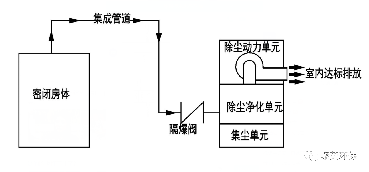 密閉房體 → 管道 → 防爆閥 → 除塵器 → 風機 → 煙囪(室內達標排放)