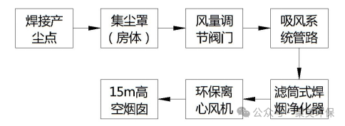 焊接點(diǎn) →半封閉房體 → 吸風(fēng)管路 →濾筒式焊煙凈化器 → 風(fēng)機(jī) → 煙囪(室外鋼平臺(tái)支撐)